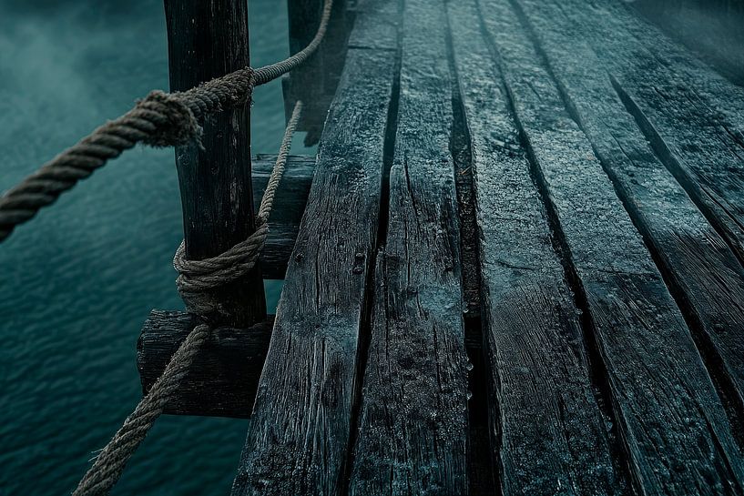 Eine von mystischer Stille umhüllte Holzplanke führt ins Ungewisse, umgeben von sanften Nebelschwaden. Die raue Textur des verwitterten Holzes und die robusten Seile verleihen dem Motiv eine besondere Tiefe. Perfekt für ein Wohnzimmer, schafft dieses Bild eine Atmosphäre der Ruhe und Anregung zum Träumen.