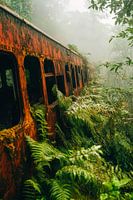 Verborgene Geschichten und Natur im Einklang: Die rostige Bahn, umringt von üppigem Grün und mystischem Nebel, erzählt von vergangenen Reisen und der Rückkehr der Natur. Ihre warmen Erdtöne harmonieren wunderbar mit einem Wohnzimmer, das Gemütlichkeit und Abenteuerlust vereint. Ein Blickfang, der zum Träumen einlädt und Gespräche anregt.