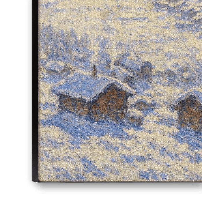 "Snowy Alpine Tranquility" bietet eine Szene tiefer Ruhe: ein weites, mit frischem Schnee bedecktes Tal, ruhig aneinandergeschmiegte Holzhütten, sanfte Hügel, die sich in fahlem Licht verlieren. Inspiriert von Claude Monets Hingabe an Atmosphäre und Farbharmonie, verwendet das Kunstwerk sanfte Blautöne, warmes Weiß, gedämpfte Grautöne und subtile Schatten, um einen meditativen Raum zu schaffen. Das Licht fällt sanft auf den Schnee, die Bäume stehen still, der Moment fühlt sich unendlich an. Es ist der Winter, destilliert in Stimmung.