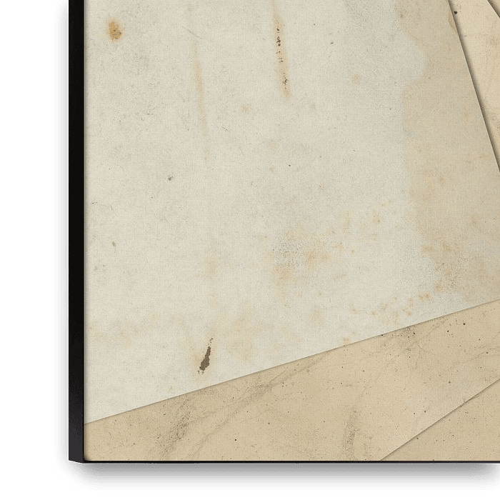 Von oben gesehen liegen verstreut fünf unbenutzte, aber alte, fleckige Papiere auf einer ebenso alten Oberfläche und bilden ihre eigene halbabstrakte Formdynamik und Geometrie. Diese Arbeit wurde digital aus Scans alter Papiere erstellt. Die neutralen Farbtöne geben der Arbeit einen rustikalen Charakter.
