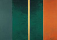 Abstrakte Komposition aus vier vertikalen Farbflächen: einem gedämpften Blaugrün, einem tiefen Smaragdgrün, einem zentralen vertikalen Goldstreifen und einem leuchtenden Orange. Die Farben weisen subtile Texturen und Übergänge auf, was dem minimalistischen Design Tiefe verleiht. Ein starker Kontrast zwischen kühlen und warmen Tönen.