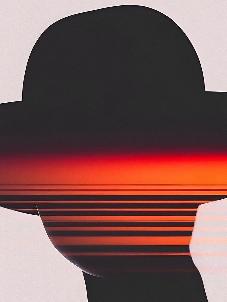 Diese künstlerische Komposition zeigt die Silhouette einer Person, die einen Hut trägt, dessen Umriss mit einer wunderschönen Landschaft bei Sonnenuntergang verschmilzt und ein Gefühl von Geheimnis und Kontemplation hervorruft.