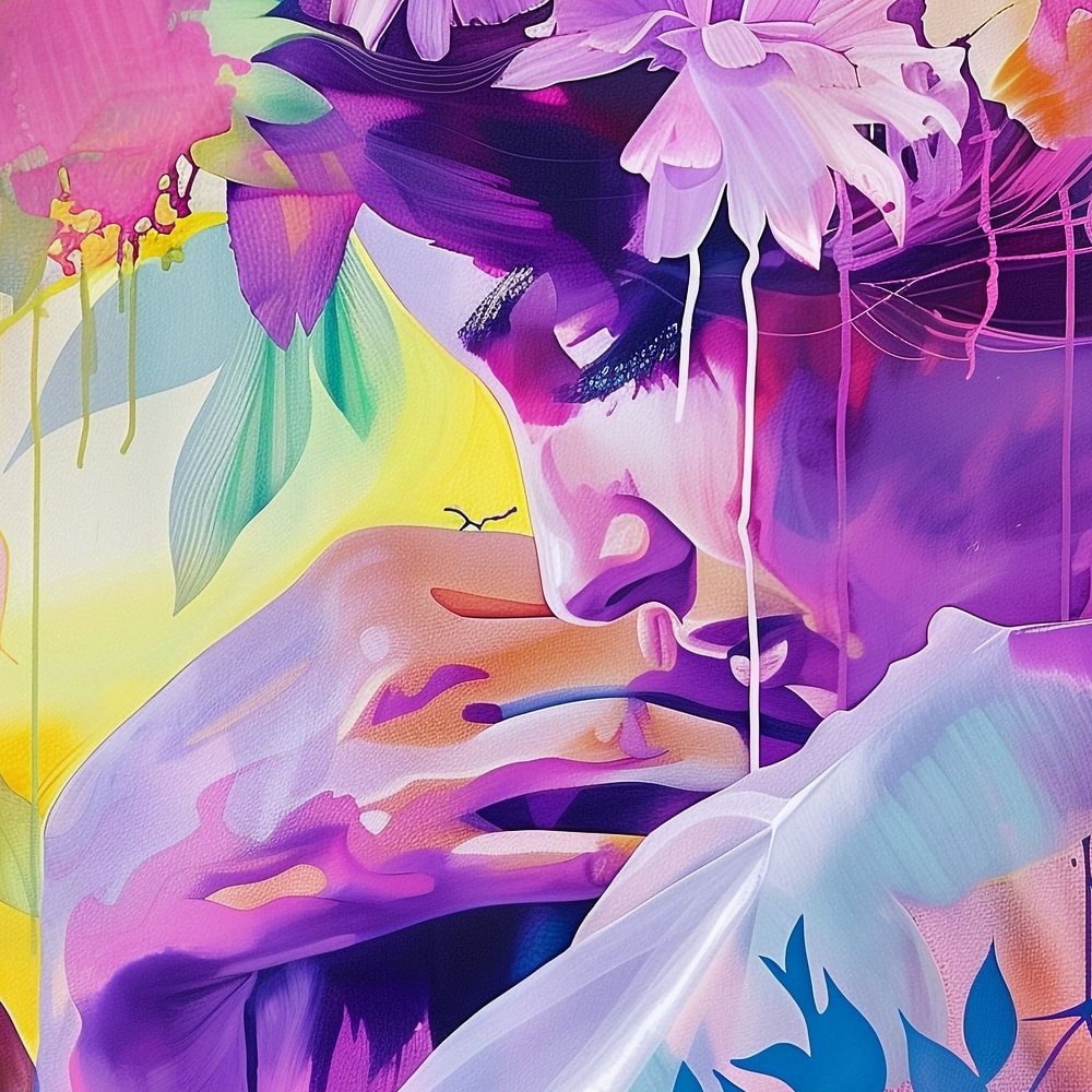 Farbenfrohe Komposition eines weiblichen Porträts, das nahtlos mit verschiedenen floralen Motiven und Blättern verwoben ist. Die Farben reichen von intensiven Violetttönen bis hin zu leuchtenden Gelb- und Grüntönen und schaffen eine dynamische und ausdrucksstarke Stimmung. Die Frau ist in einer kontemplativen Pose dargestellt, eine Hand ruht auf ihrem Kinn, die Augen sind geschlossen und strahlen ein Gefühl von Introspektion und Ruhe aus.