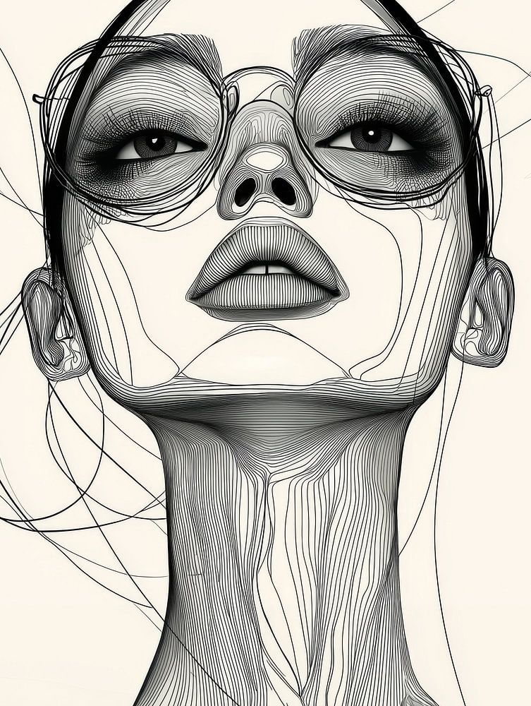 "Interwoven Shadows" ist eine faszinierende Illustration, die ein weibliches Porträt zeigt, dessen Gesicht und Körper in detaillierten Linien und subtilen Schatten wiedergegeben sind. Das Porträt besteht aus einer Kombination von eleganten, stilisierten Linien, die ihr Gesicht umrahmen, während ihr Gesichtsausdruck und ihr Blick ruhig, aber entschlossen wirken. Die Linien stellen nicht nur die Form ihres Gesichts dar, sondern unterstreichen auch die Bewegung ihres Haars und die Energie, die von ihrem Körper ausgeht. Die Verwendung dünner schwarzer Linien vermittelt ein Gefühl von Zerbrechlichkeit und Stärke zugleich, während die abstrakten Formen ihrer Kleidung und der visuelle Fluss der Linien in Richtung der Ecken der Leinwand Dynamik und Freiheit widerspiegeln. Der minimalistische Einsatz von Farbe unterstreicht die Einfachheit und Stärke der Linienzeichnungen und hebt den detaillierten Ausdruck der Frau und ihre kraftvolle und doch elegante Präsenz hervor. Das Werk erkundet die Spannung zwischen Realismus und Abstraktion mit einer raffinierten Annäherung an die menschliche Form.