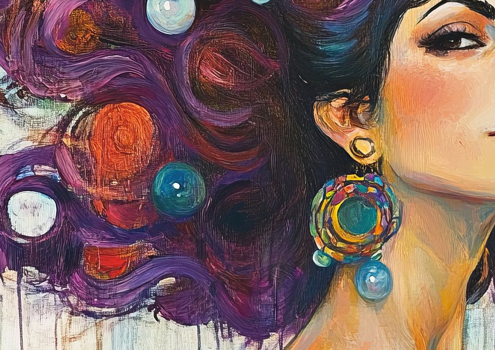 Details: modernes Porträt, Frau, farbenfroh, ausdrucksstarke Augen, Ohrring, lebendiger Haarschopf, lila, rot, blau, moderne Kunst
