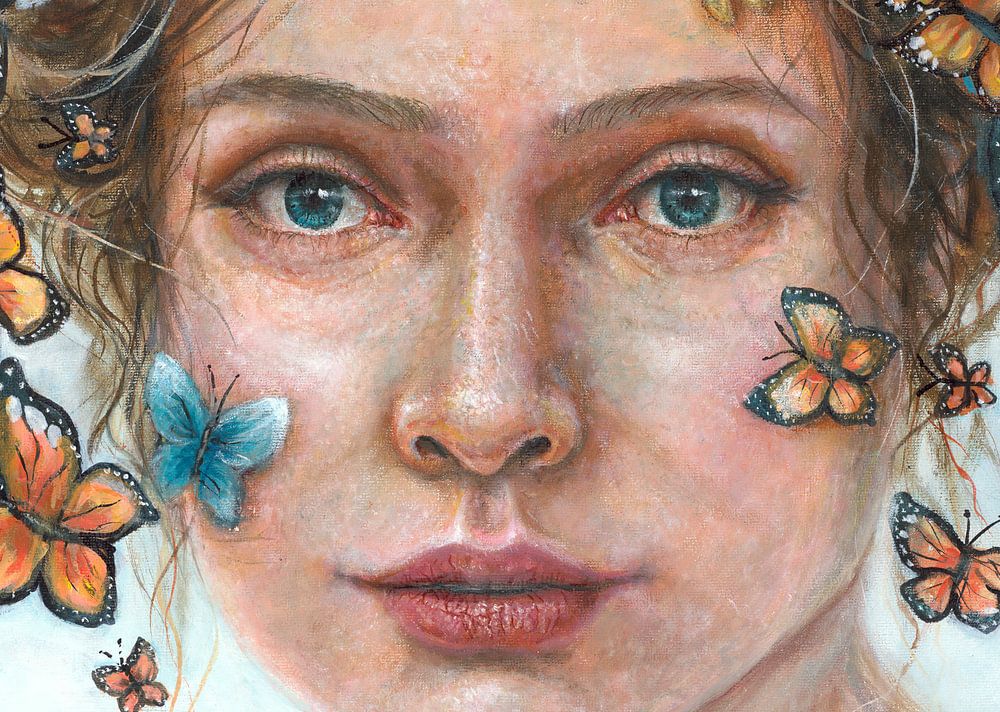Gedanken des Friedens, der Positivität, der Ermutigung, der Hoffnung und der Liebe repräsentieren den Schmetterling in Gold auf ihrer Stirn.