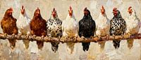 Dieses humorvolle und zugleich ästhetische Gemälde zeigt eine Reihe unterschiedlich gefärbter Hühner, die nebeneinander auf einer Stange sitzen. Jedes Tier ist individuell gestaltet und hebt sich durch Farbgebung und Struktur hervor, wodurch eine lebendige und abwechslungsreiche Komposition entsteht. Die dick aufgetragenen Pinselstriche…