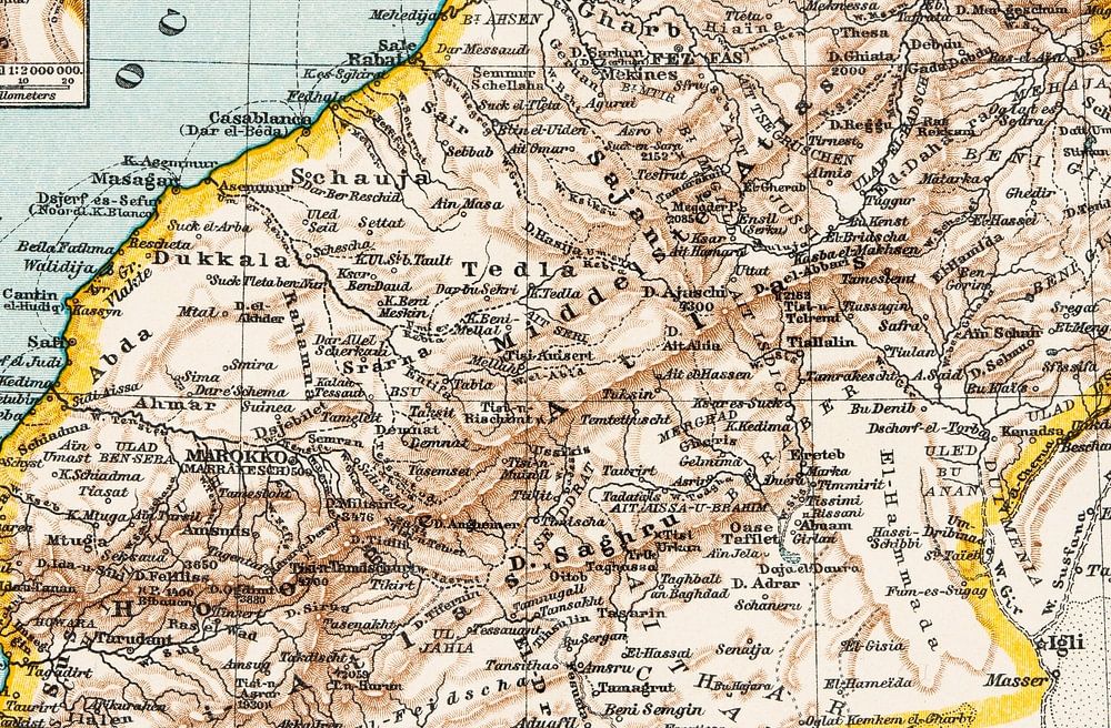 Antike Farbkarte von Marokko aus der Zeit um 1900.