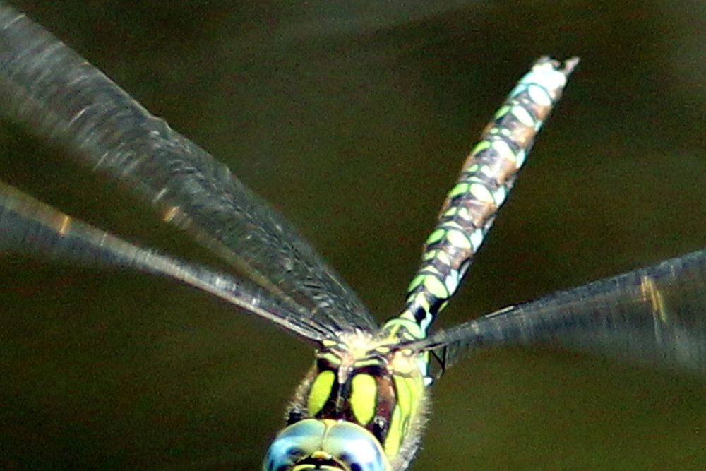 Deze bruinrode Heidelibel (Sympetrum striolatum) was heerlijk boven een vennetje op zoek naar een smakelijk hapje