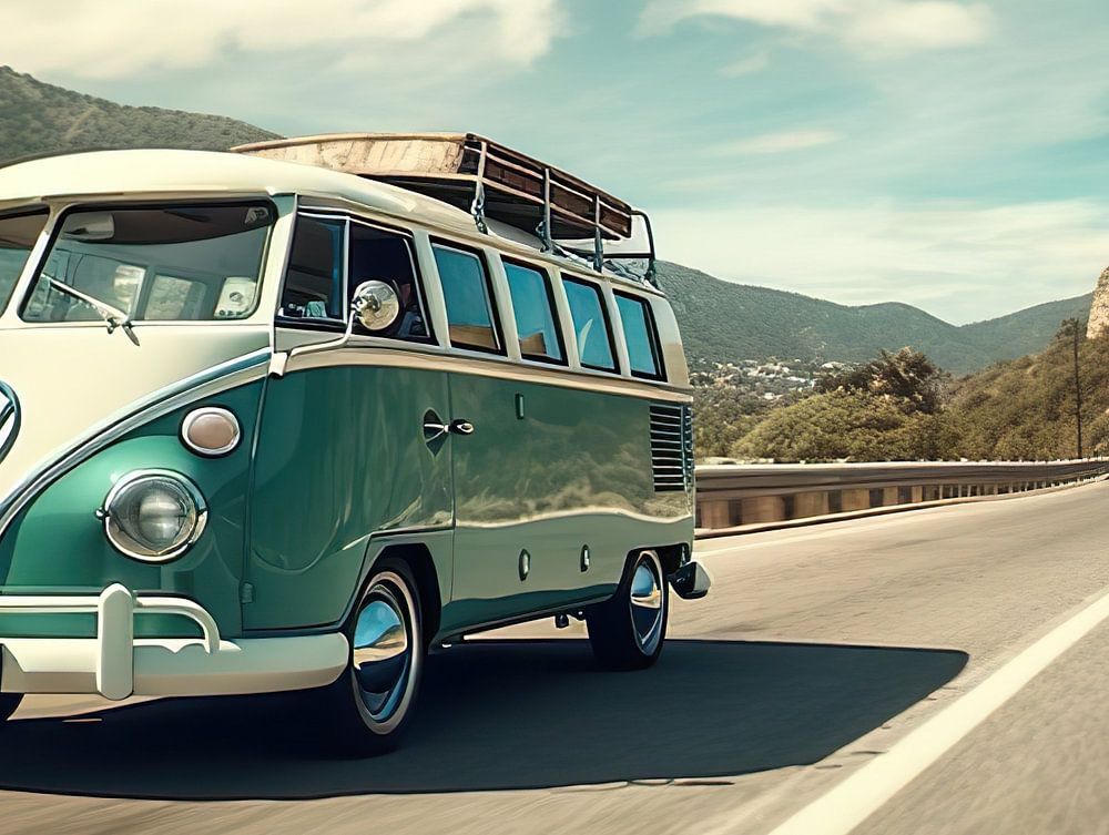 Die Wohnmobile T5 und T6 (California) wurden von Volkswagen selbst entwickelt und produziert. Das allererste T1-Modell mit der Windschutzscheibe mit einer Metallstange in der Mitte, der Gitterbus oder Microbus / Transporter, wurde zwischen dem 8. März 1950 und Ende 1967 produziert. Diesen Volkswagen Transporter T1 in einer kalifornischen Landschaft fahren zu sehen, ist fast einmalig. Ein tolles Bild für den Enthusiasten an der Wand.