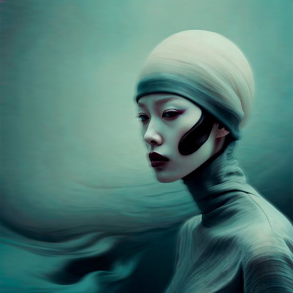Zu sehen ist ein seitliches Porträt, ruhig und präzise modelliert, vor einem weichen, türkisfarbenen Raum. Der Hintergrund wirkt wie Nebel oder wie Wasser in Bewegung, mit feinen Strömungslinien, die sich erst beim zweiten Blick zeigen. Ein kleines, charakteristisches Detail ist der dunkle, geschwungene Akzent an der Wange, er setzt…