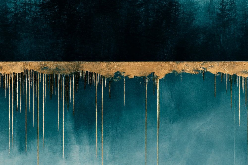 Mystische Nebel umhüllen düstere Wälder, während goldene Tropfen wie flüssiges Licht den Horizont durchbrechen. Dieses faszinierende Zusammenspiel aus tiefen Grüntönen und strahlendem Gold schafft eine träumerische Atmosphäre, ideal für ein Wohnzimmer oder Schlafzimmer, wo die Ruhe der Natur zur Entspannung einlädt. Ein wahrer Blickfang, der zum Verweilen einlädt.