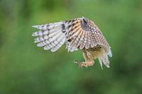 Waldohreule im Flug mit dem Auge genau zwischen den Federn.