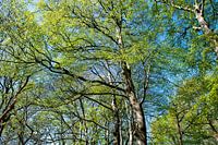 Leuchtend frische, grüne Blätter von hohen Bäumen vor blauem Himmel. Die dunklen Zweige der Baumkronen heben sich deutlich vom Himmel und den jungen Blättern ab.