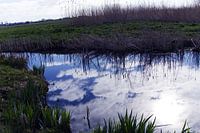 An einem windstillen Tag, an dem der Himmel nicht ganz blau ist, spiegeln sich die Wolken im Wasser des Poldergrabens.