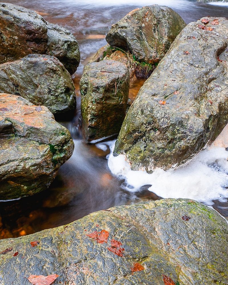 Bayehon-Wasserfall Der höchste Wasserfall Belgiens in den Ardennen in der Nähe von Malmedy, aufgenommen am 9. Januar 2023, an einem grauen und regnerischen Tag. Die braunen/roten Blätter auf den Steinen und im Wasser geben dem Bild noch ein wenig mehr Kontrast und Farbe. Sony A711 16 mm Objektiv 2sec F16 ISO 100 CP Filter