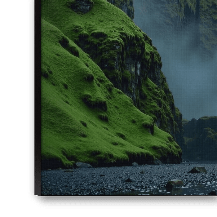 Ein großer Wasserfall stürzt zwischen moosbewachsenen Felsen in die Tiefe. Eine Person steht auf einem Felsen am Fuße des Wasserfalls. Die vorherrschenden Farben sind Grün, Grau und Weiß.