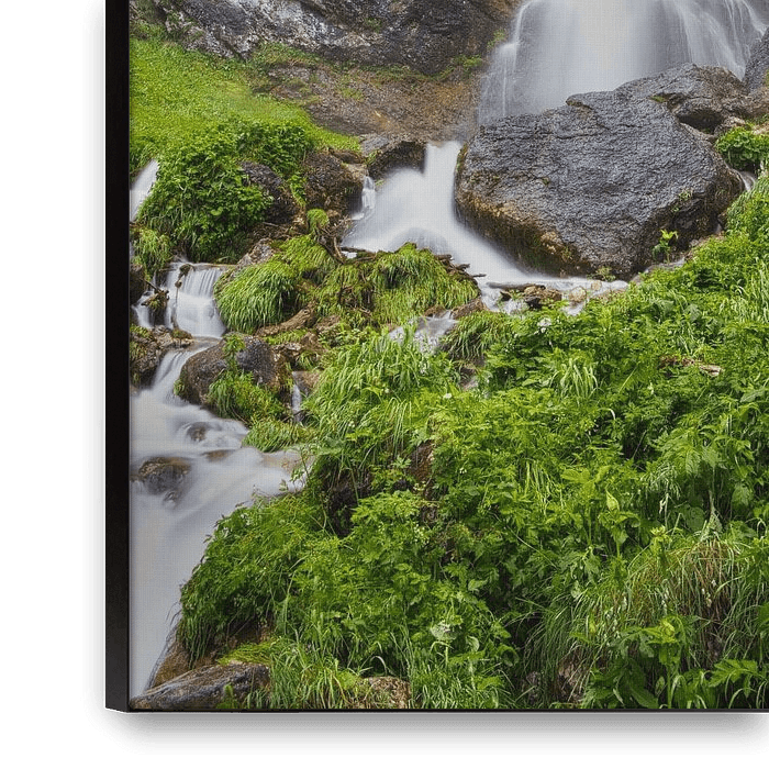 Langes Licht zieht das Wasser zu seidigen Schleiern, weiß wie Atem in Bewegung. Der Fels dunkel, scharf, unbeweglich-jede Kante ein Kontrast zur fließenden Zeit.