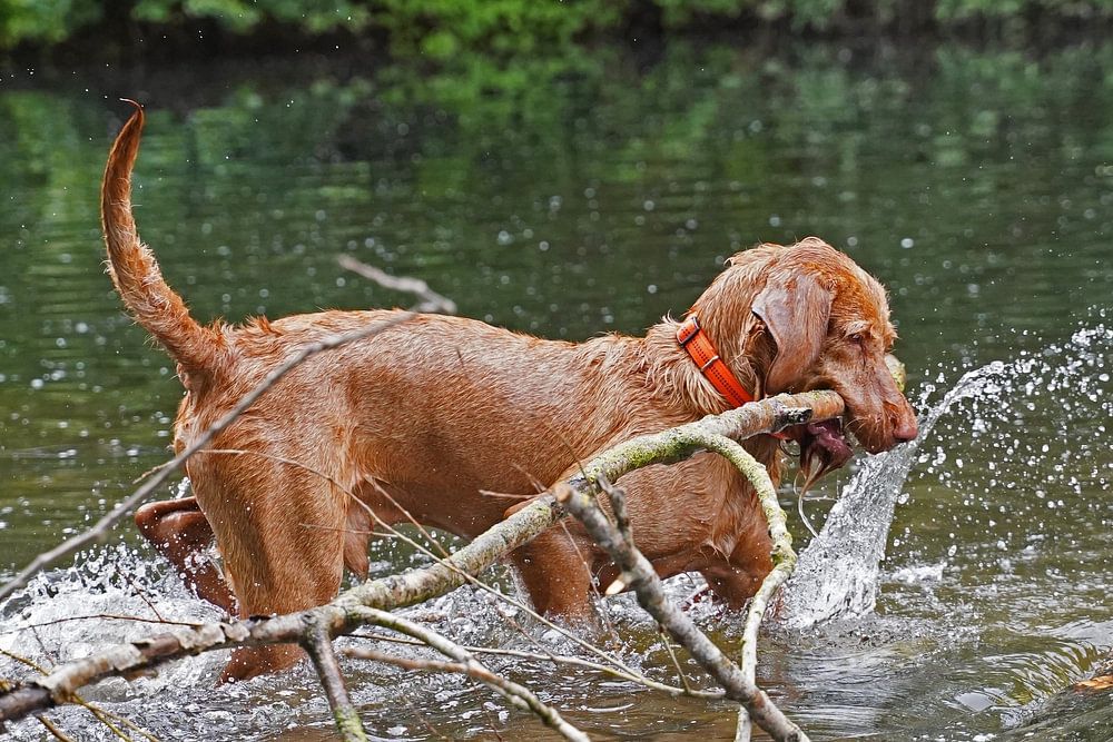 Wasserspiele am See mit einem braunen Magyar Vizsla Drahthaar.