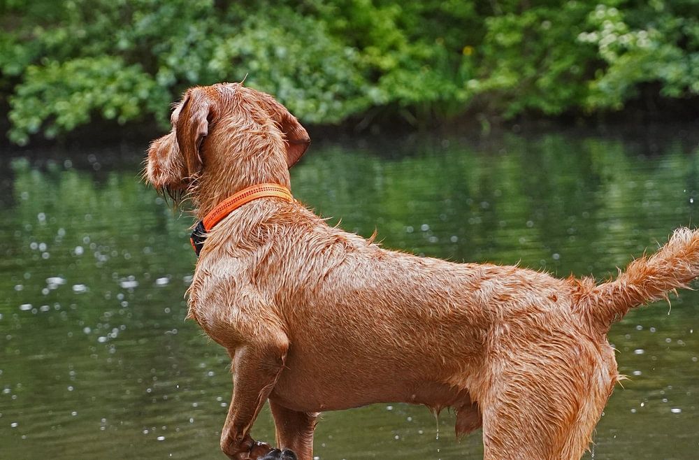 Wasserspiele am See mit einem braunen Magyar Vizsla Drahthaar.