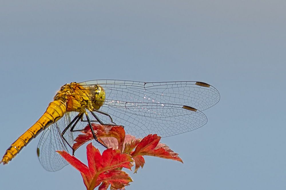 Weibchen des blutroten Heidelibels (Sympetrum sanguineum). Die Art nennt dies so, weil die Männchen rot sind, obwohl die Weibchen gelb sind.