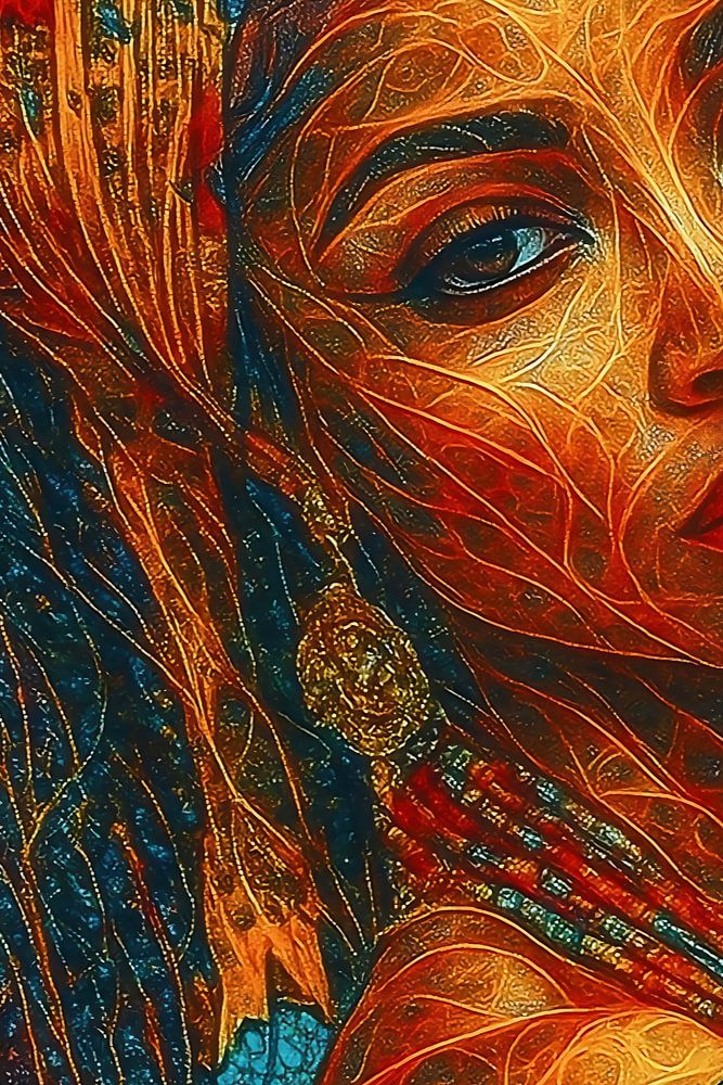 Dieses Gemälde zeigt das Porträt einer Frau mit einem tiefen, intensiven Blick. Sie trägt ein farbenfrohes Kopftuch in Orange- und Goldtönen, kombiniert mit einem blauen Band. ihre Haut ist mit einem Muster aus Linien und Formen dargestellt, die den Eindruck von Textur und Energie vermitteln, und sie trägt auffälligen Schmuck, darunter einen Ohrring und eine Perlenkette. der Hintergrund und Teile ihrer Kleidung sind ebenfalls mit organischen, gewundenen Linien in leuchtenden Farben detailliert, was dem Ganzen ein spiralförmiges und fast psychedelisches Aussehen verleiht. das Kunstwerk zeichnet sich durch eine reiche Verwendung von Farben und komplizierten Mustern aus.