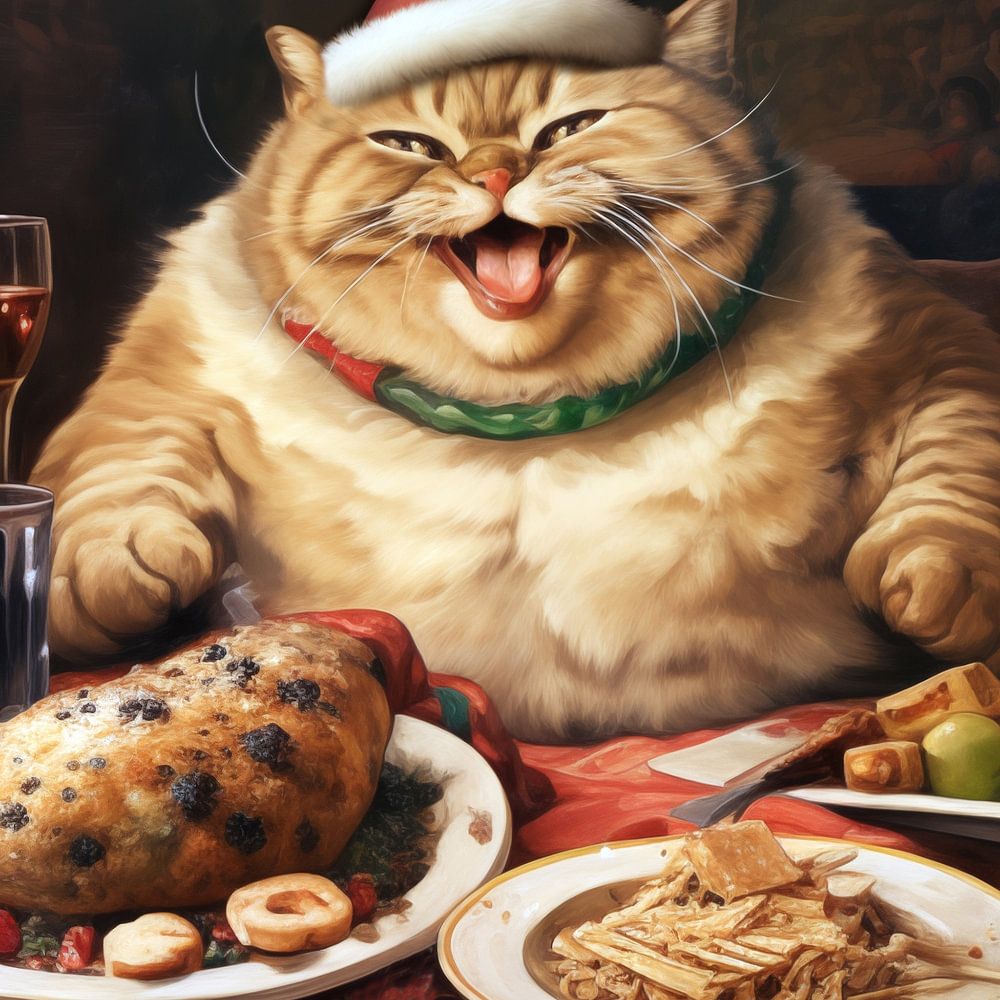 Porträt einer glücklichen übergroßen (oder sagen wir fetten) Katze beim Weihnachtsessen mit einem üppig gedeckten Tisch, Kerzen, Wein und einem gemütlichen Ambiente.