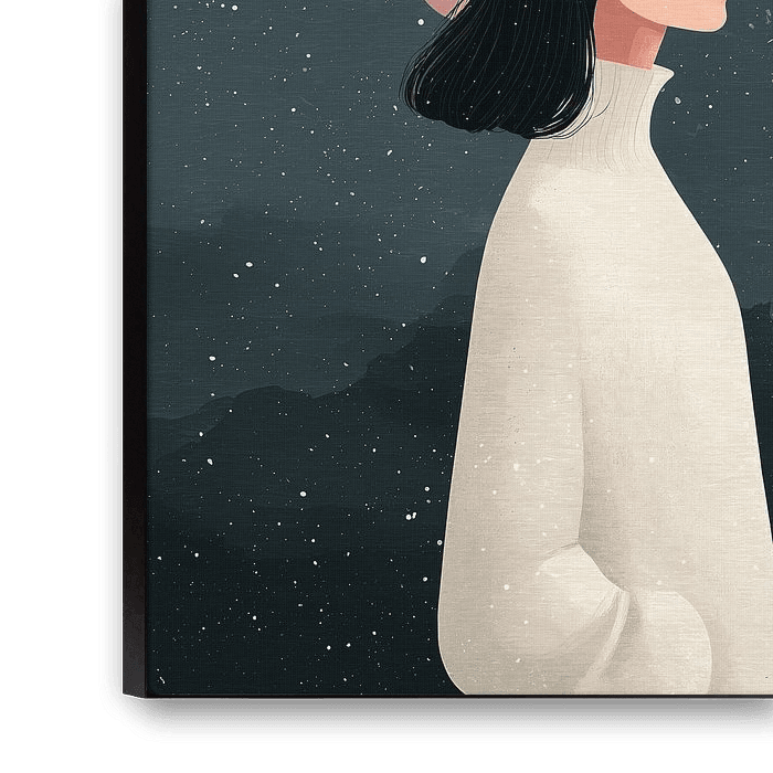 Eine Illustration in Pastellrosa und Dunkelblau zeigt eine Frau in einem weißen Rollkragenpullover vor nächtlichem Hintergrund. Über ihrem Kopf schwebt eine traumhafte Komposition aus rosa und pfirsichfarbenen Kreisen, verziert mit botanischen Elementen und einer geheimnisvollen schwarzen Katze. Die Illustration verströmt eine ruhige, traumhafte Atmosphäre und fängt auf wunderschöne Weise die Spannung zwischen Realität und Fantasie ein.
