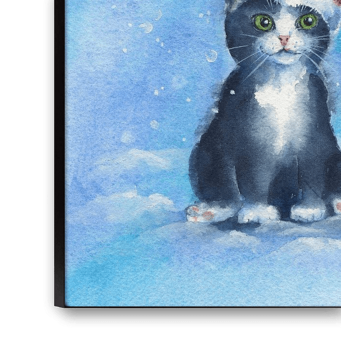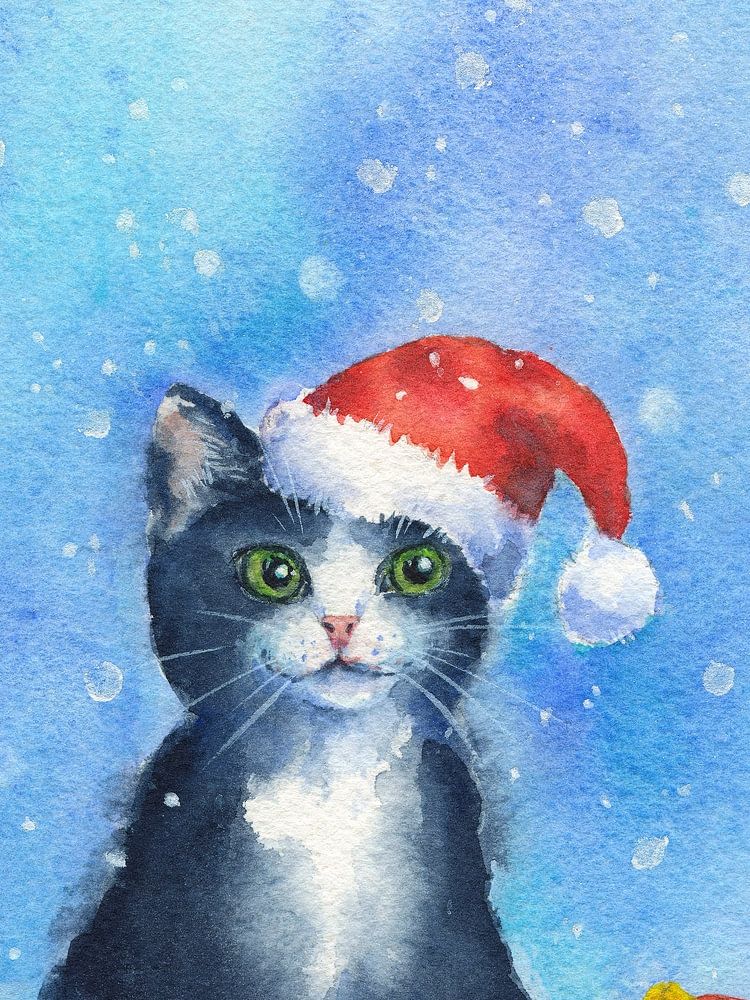 Weihnachtskätzchen im Schnee ist ein handgemaltes Aquarellgemälde im Hochformat der Künstlerin Karen Kaspar.