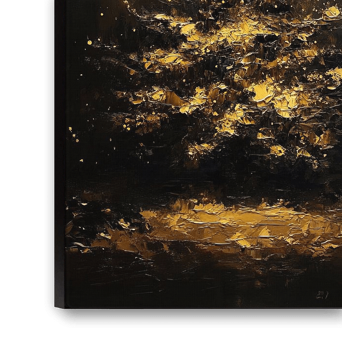 Weihnachtsstern | Goldener Weihnachtsbaum - Dieses weihnachtliche Gemälde zeigt einen glitzernden, prächtig beleuchteten Weihnachtsbaum, der überwiegend in Gold- und dunklen Tönen gehalten ist, mit einem auffälligen, leuchtenden Stern auf der Spitze vor einem dunklen, fast schwarzen Hintergrund.
