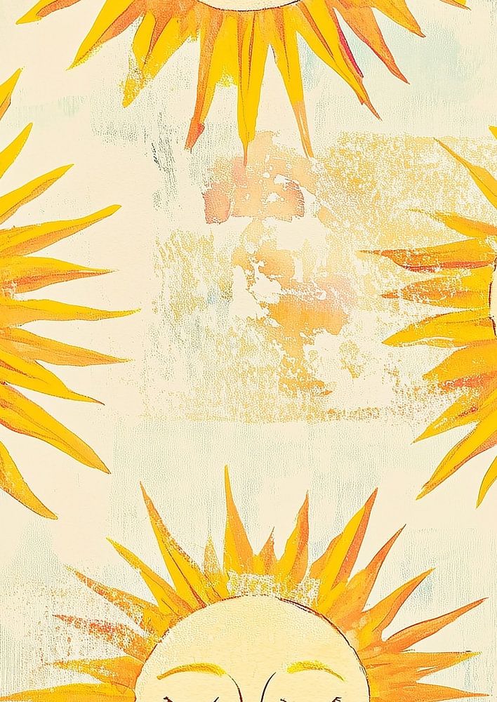 Dieses Design kombiniert gelbe und rosafarbene Sonnen mit Gesichtern in der Mitte jedes Musters, die in hellen und fröhlichen Farben leuchten und einen dynamischen und lebendigen Look erzeugen. An den Rändern sind florale Muster verstreut, die zu der verspielten und charmanten Atmosphäre beitragen. Die sanfte Pastellfarbpalette und die Aquarellstruktur verleihen dem Design eine raffinierte und beruhigende Ausstrahlung. Mit seinem Vintage-Look und dem Hintergrund aus altem Kunstdruckpapier bietet dieses Design einen nostalgischen und künstlerischen Touch. Perfekt für alle, die eine verspielte Kombination aus modernen und klassischen Elementen lieben. Dieses Design bringt eine fröhliche und sonnige Atmosphäre in jeden Raum, auch in Kinderzimmern.