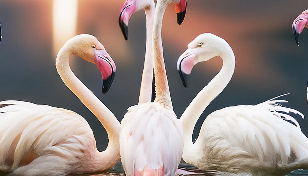 Weiße Flamingos im See mit Sonnenuntergang