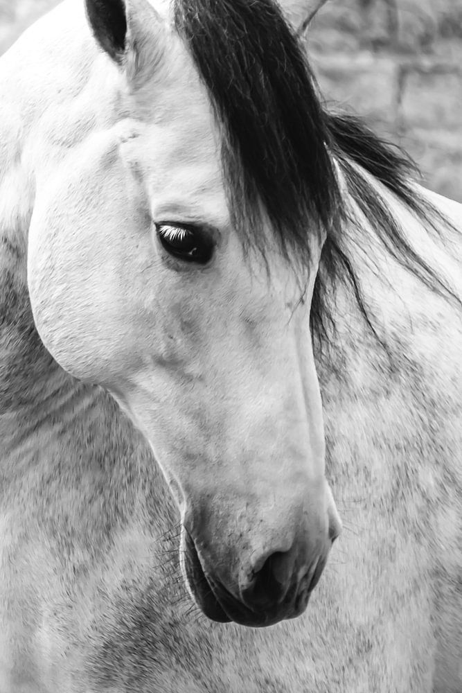 Porträt eines schönen spanischen PRE-Pferdes (Pura Raza Espanola) in einer monumentalen Kirche. Das Pferd ist einzigartig in seiner Farbe, weiß mit grauen Äpfeln und mit der schwarzen Mähne und dem schwarzen Schweif ein besonderes Aussehen. Das Pferd ist von oben links, wo das Tageslicht durch die Fenster scheint, wunderschön beleuchtet. Das Foto ist in Schwarz-Weiß gehalten, was ihm ein besonders luxuriöses Aussehen verleiht.