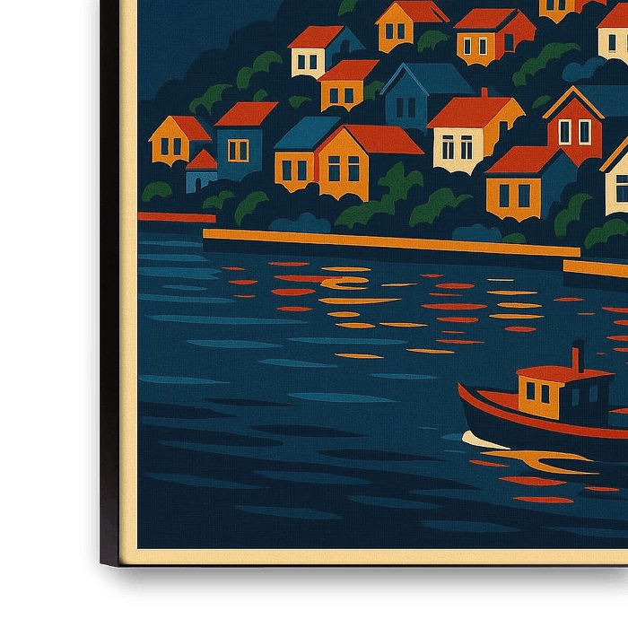 Seine kühnen Formen und satten Farben machen es als gerahmten Druck, Leinwand oder Poster besonders eindrucksvoll. Das Gefühl der Wärme, das von den beleuchteten Häusern ausgeht, schafft eine einladende Stimmung, die Komfort und Energie in jedes Interieur bringt.