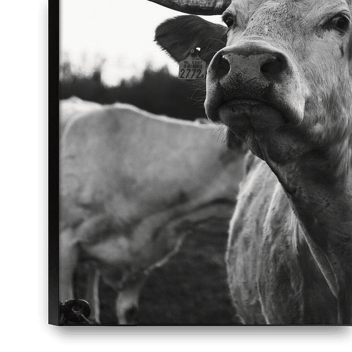 Bestelle dieses Kuh-Wandbild Wer sind Sie? von Sabine Timman als Reproduktion auf Leinwand, Alu-Dibond, als Poster, Fototapete oder Acrylglasbild.