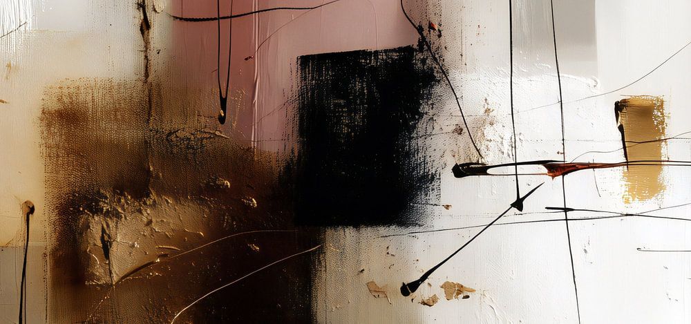 Abstraktes, minimalistisches Gemälde auf einer hellen Leinwand mit braunen, schwarzen, altrosa und beigen Farbblöcken und schwarzen chaotischen Linien.