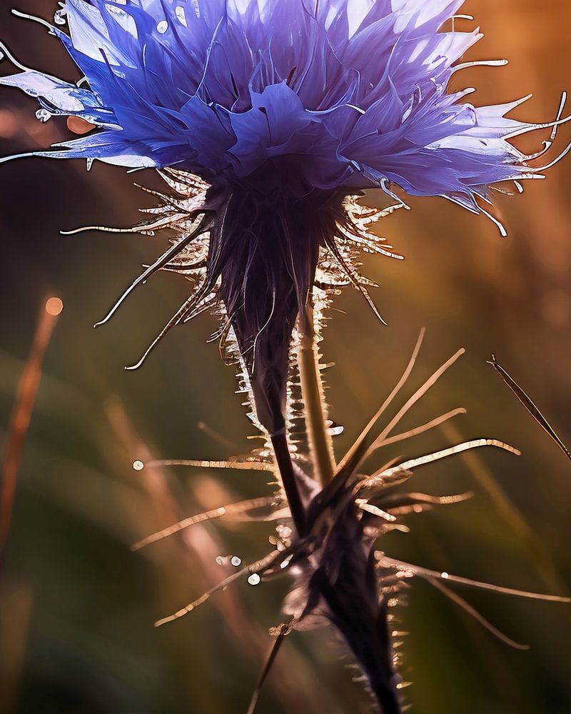 Nahaufnahme einer Wildblume, romantische und geträumte Szene in der Natur zum Sonnenuntergang