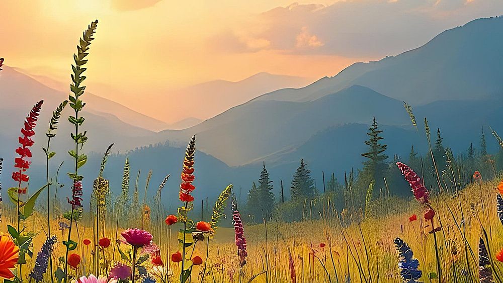 In diesem atemberaubenden Bild entfaltet sich ein lebendiges Farbenmeer aus prächtigen Wildblumen und sanften Gräsern, die harmonisch in einer malerischen Wiese angeordnet sind. Die Wildblumen strahlen in einer Vielzahl von Farben – leuchtendes Gelb, tiefes Violett, strahlendes Rot und sanftes Blau – und schaffen ein faszinierendes Zusammenspiel, das die Sinne anspricht. Die Blumenblüten sind in verschiedenen Formen und Größen gestaltet, von zarten, filigranen Blüten bis hin zu robusten, kraftvollen Pflanzen, die sich im sanften Wind wiegen.