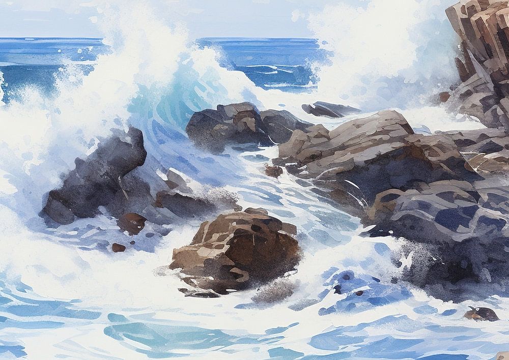 Raging Waves | Foam on the Rocks - Dieses Bild fängt die energiegeladene Essenz der tobenden Meereswellen ein, die in einem dynamischen Zusammenspiel von Schaum und spritzendem Wasser gegen die felsige Küste prallen. Kräftige Pinselstriche und eine reiche Palette von Blau-, Weiß- und Brauntönen verleihen der Szene eine fast greifbare Textur, während das Spiel von Licht und Schatten für einen natürlichen Kontrast sorgt.