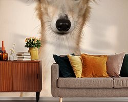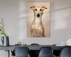 Portret van een silken windsprite een langharige whippet tegen een ton-sur-ton creme achtergrond