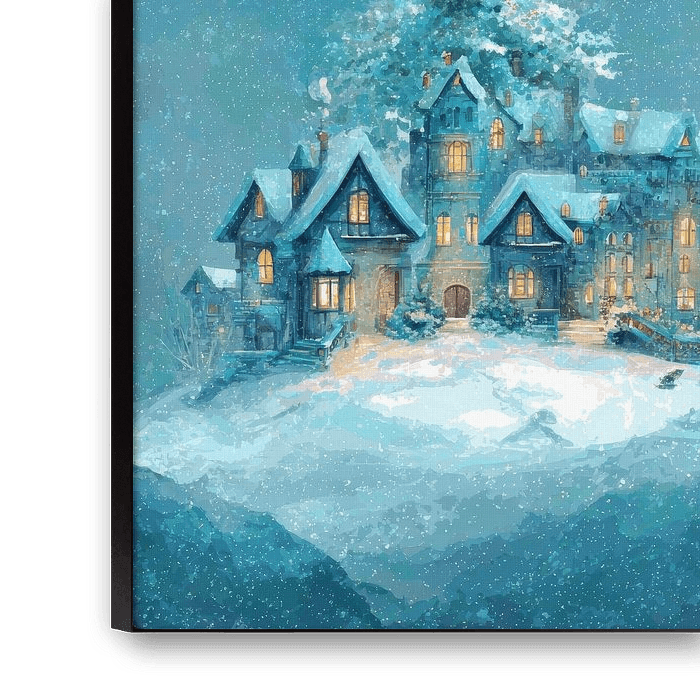 In dieser malerischen Winterlandschaft thront ein großes Haus auf einem verschneiten Hügel, umgeben von sanftem Schneefall und einem imposanten Weihnachtsbaum, der sich majestätisch hinter dem Dach erhebt. Der warme Schein der Fenster kontrastiert wunderschön mit den kühlen Blautönen der Umgebung und schafft eine einladende und magische…