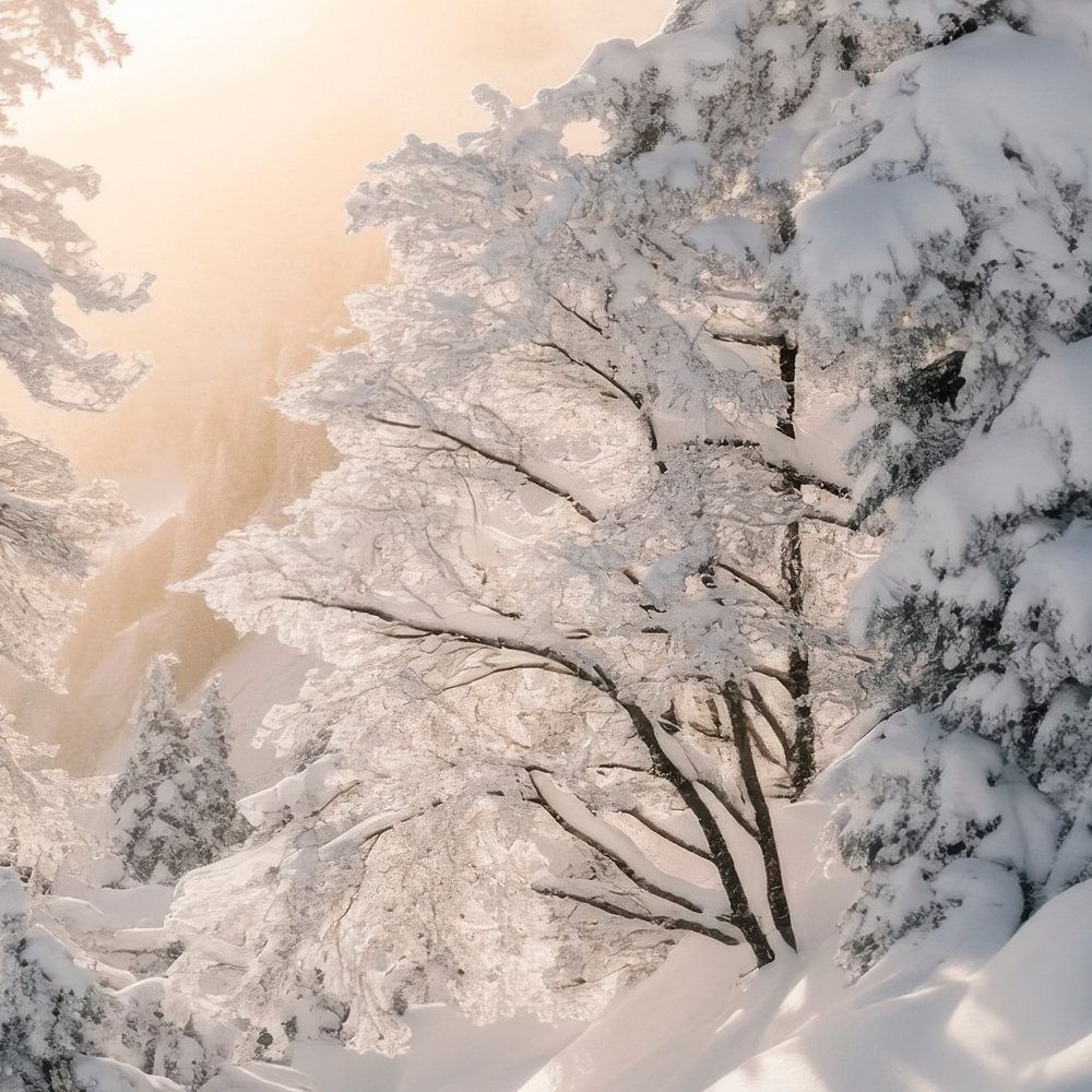 Zart glitzert der Schnee in der sanften Morgenröte, während verschneite Bäume wie funkelnde Skulpturen aus einer anderen Welt emporragen. Die weichen, geschwungenen Formen der Schneehauben verleihen der Landschaft eine traumhafte Eleganz, und das Licht, das durch die Äste bricht, schafft eine magische, fast mystische Atmosphäre. Ein Moment der reinen, stillen Schönheit.