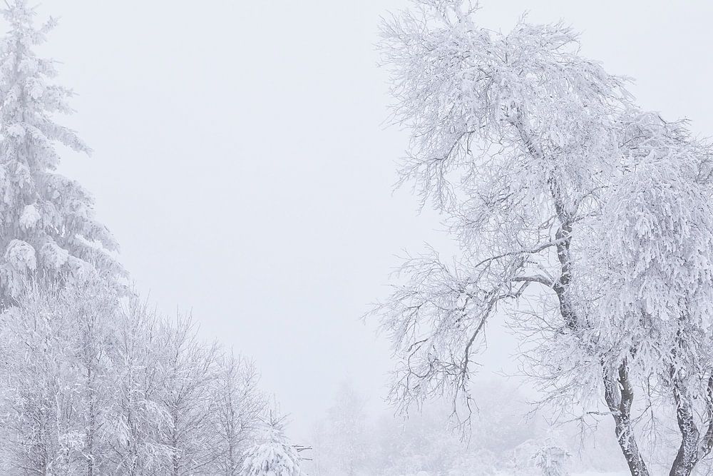 Dieses malerische Bild im bezaubernden Hohen Venn Belgiens zeigt die reine, unverfälschte Schönheit eines Wintertages. In der Mitte stehen zwei majestätische Bäume, deren Äste schwer mit einer dicken Schicht Neuschnee beladen sind. Die heitere Stille der Umgebung wird durch den grauen, nebligen Himmel noch verstärkt, der die kalte und ruhige Atmosphäre des Augenblicks widerspiegelt. Auf der linken Seite des Bildes sind weitere Bäume zu sehen, von denen jeder mit seiner eigenen schimmernden Schneedecke bedeckt ist, was das Gefühl der endlosen Winterpracht noch verstärkt.