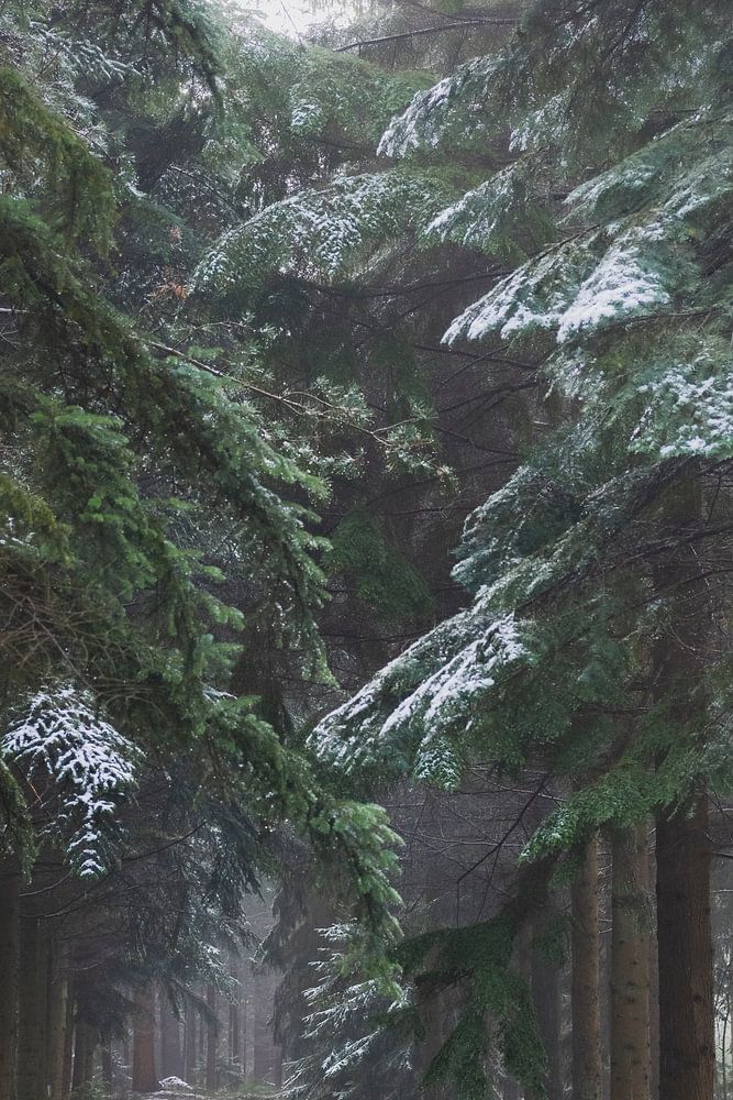 Winterlicher Kiefernwald an einem kalten Wintertag mit einer dünnen Neuschneeschicht im Naturschutzgebiet Veluwe in der Nähe der Stadt Hattem in Gelderland, Niederlande.