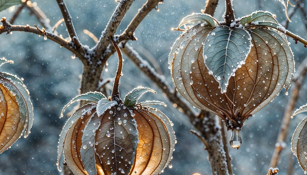 "Winter Light - Icy Lanterns" ist ein stimmungsvolles und verträumtes Kunstwerk, das den Zauber des Winters zum Leben erweckt. Im Vordergrund sehen wir einen Zweig mit fünf laternenähnlichen Früchten, die von einer dünnen Schicht aus Raureif und Eis umhüllt sind. Jede "Laterne" strahlt ein weiches, warmes Licht aus - als würden sie in der kalten Stille eines Wintermorgens von innen heraus leuchten. Feine Eiskristalle und schmelzende Tröpfchen betonen die Zerbrechlichkeit dieser Szene, während sich im Hintergrund schneebedeckte Bäume in einer nebligen, blaugrauen Landschaft abzeichnen.
