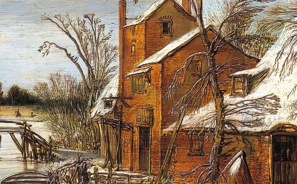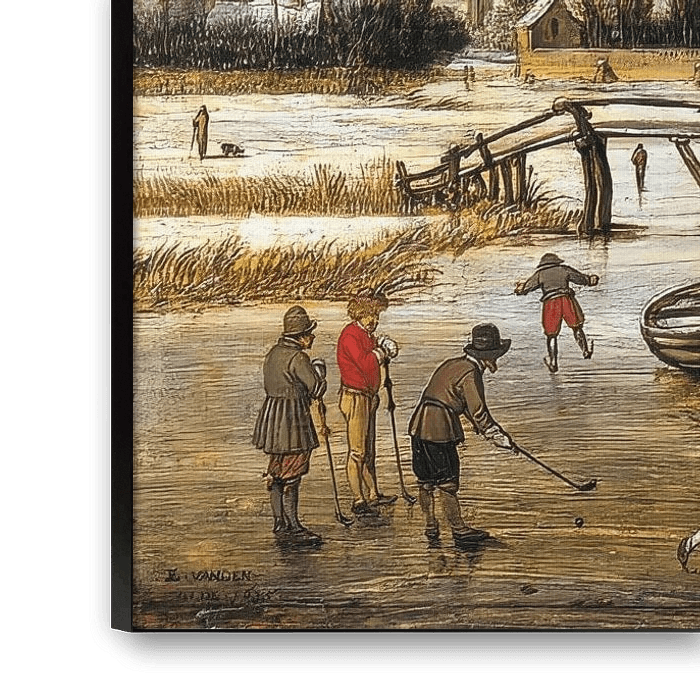 Entlang des Flussufers breitet sich ein malerisches Dorf aus, mit malerischen Backsteinhäusern und Gebäuden zwischen kahlen, schneebedeckten Bäumen. Die Architektur ist charakteristisch für das Goldene Zeitalter der Niederlande, mit Stufengiebeln, Schornsteinen und kunstvollen Holzarbeiten, die die Gebäude schmücken.
