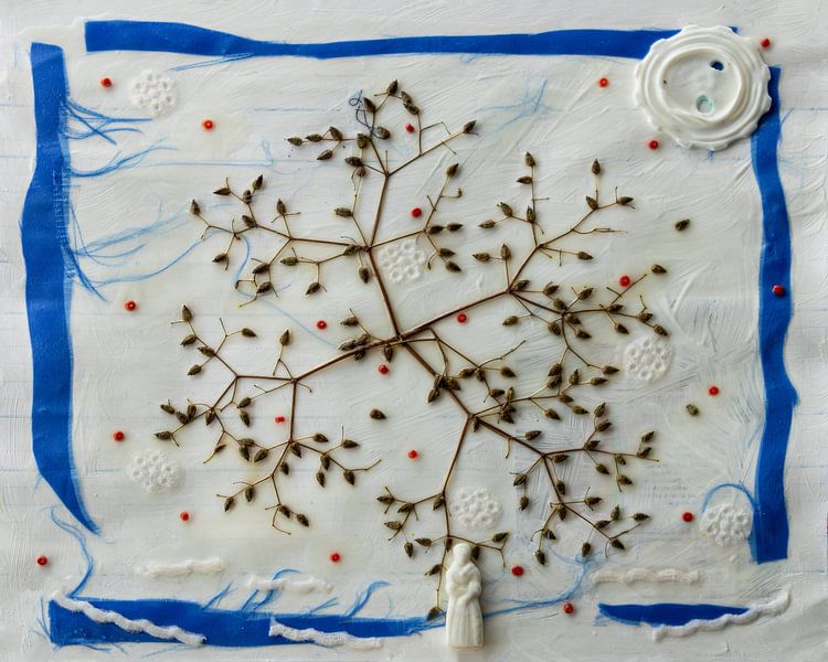 Collage mit kleinen Samen auf dünnen Zweigen, rote Perlen, weiße Spitze, blauer Seidenstoff, weißer Knoten von https://www.storytelling-design.nl/pou-belle-design/ aus einem Kunststoff-Flaschenverschluss (Abfall), weiße Figur aus ... ich weiß nicht, Acrylfarbe, und mit Klebelack veredelt.