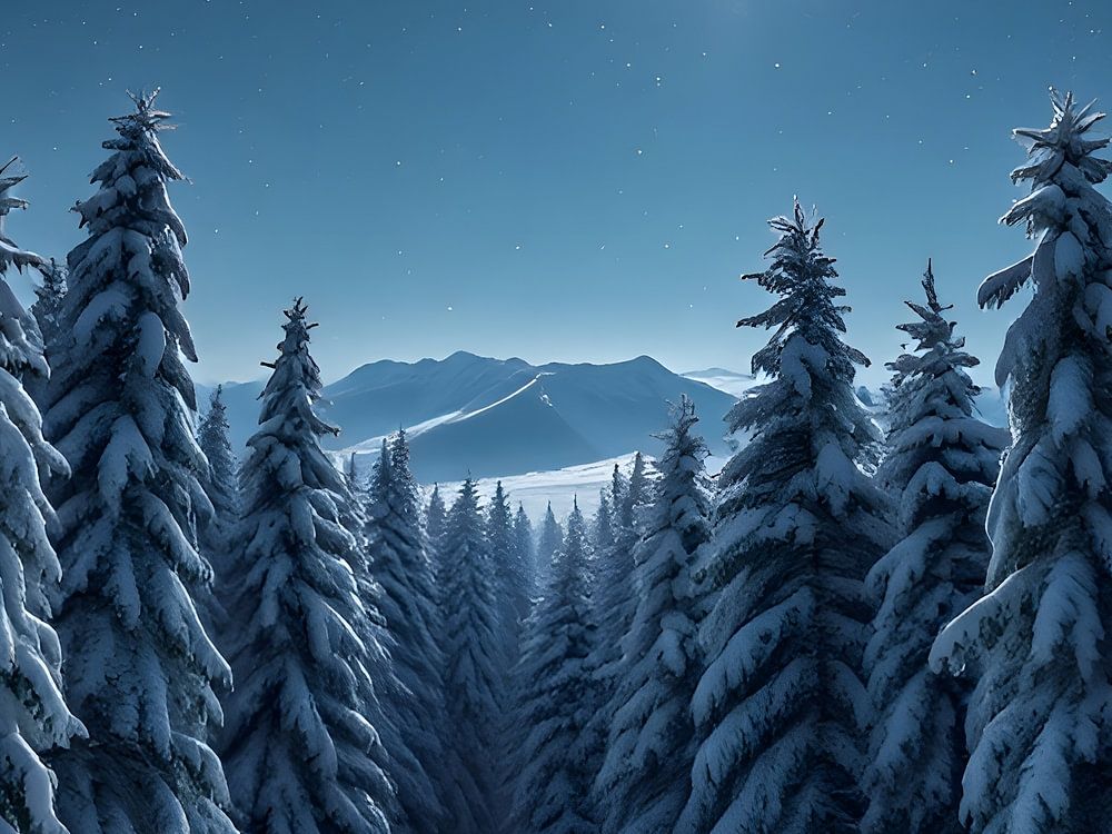 Die Szene zeigt eine tief verschneite Waldlandschaft in einer klaren, frostigen Nacht. Mächtige Tannen, schwer beladen mit Schnee, säumen einen schmalen Pfad, der in die unberührte Wildnis führt. Im Hintergrund erheben sich majestätische Berge, deren Gipfel vom sanften Licht des Vollmonds bestrahlt werden. Der Himmel ist von zahllosen Sternen übersät, und das leuchtende Mondlicht taucht die Szenerie in eine verträumte, friedliche Atmosphäre. Die Stille der Nacht verstärkt den Zauber dieses winterlichen Naturwunders.