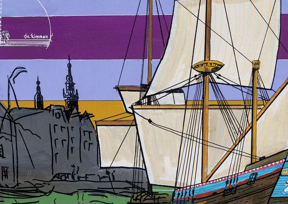 Im Hintergrund sehen Sie Amsterdam, wie es um 1596 aussah. Auf der linken Seite sehen Sie zum Beispiel den Schreierstoren.