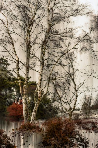 Mehrfachbelichtung einer Winterlandschaft in der Wolfhezerheide in Doorwerth, in der Veluwe in Gelderland. Es schneit und alles ist weiß. Durch das Zusammenfügen von Fotos in der Kamera erhält man einen kunstvollen Effekt.